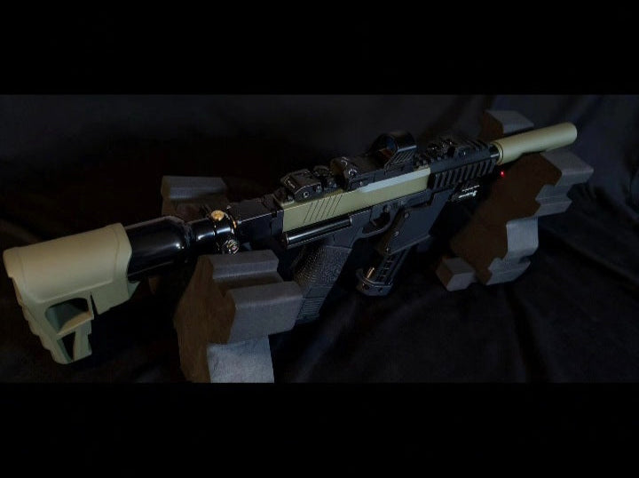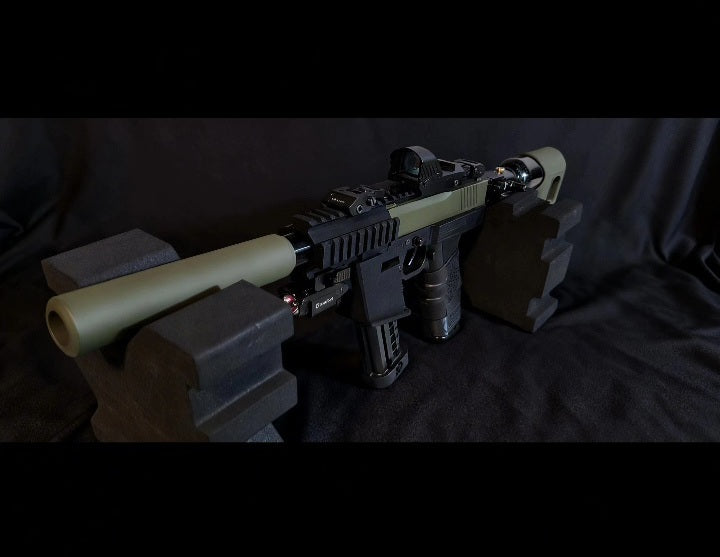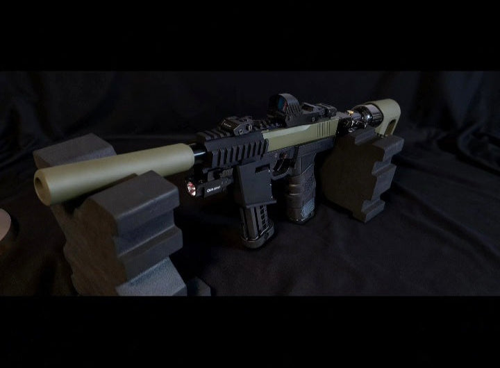 This one is set at 80+joules with just a 9inch barrel. The upper receiver, suppressor, and buttstock has been cerakoted Military Green O.D. This one also has the beefed up internals, 10ci tank with hero 2 regulator that is running 900 psi, olight tac light and red dot laser, red dot sight, front and rear sights, 6 round mag, plus an 8 round t.8.1 mag with slip cover. Any questions regarding this launcher, feel free to contact me by phone or email. T.CROWE