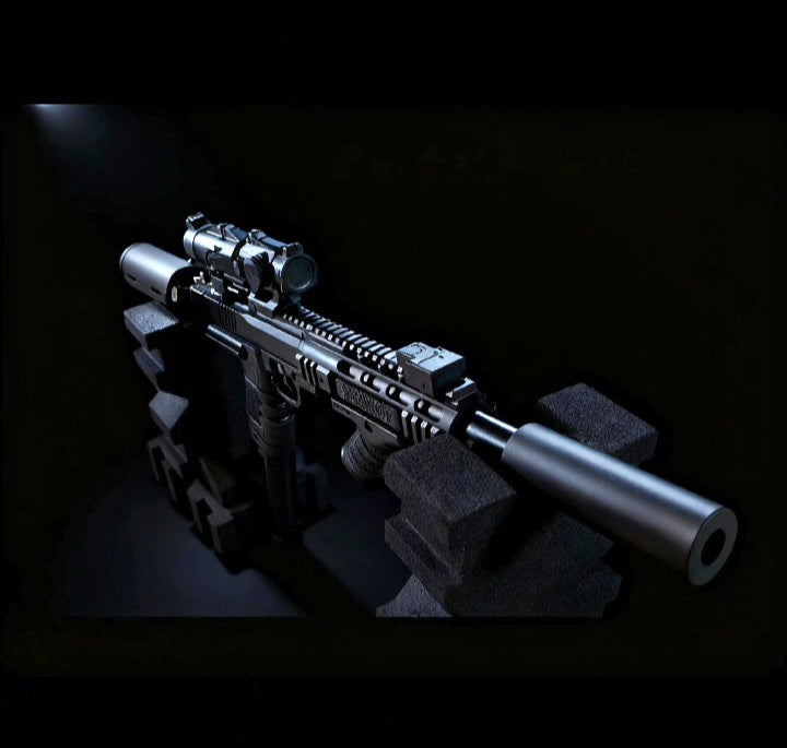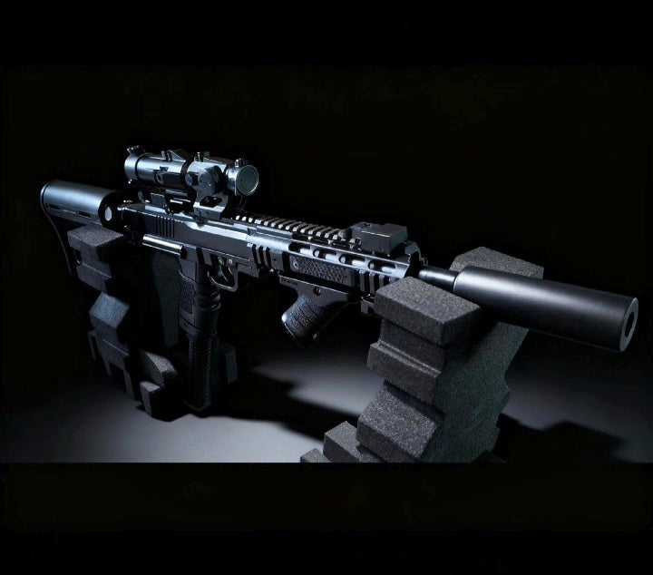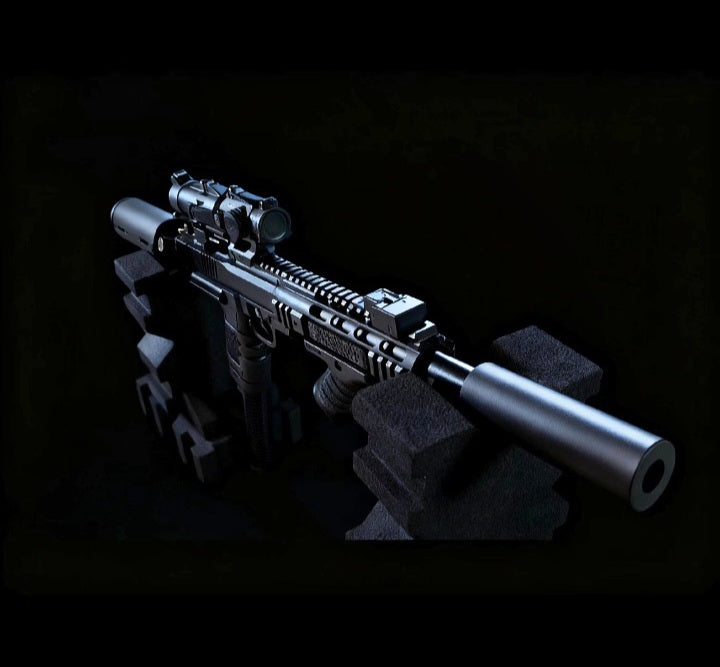 Another Carbine that is set and ready for action, Red dot sight, Magnifier, 1000psi output pressure, Forgrip with mini red dot lazer in mounted in front, 686 rough suppressor with black sandable acrylic overlay, front and rear flip up sights, Extended magazine, Oldschool Lapco 683 Rifled Barrel, and CLL POWER MOD.