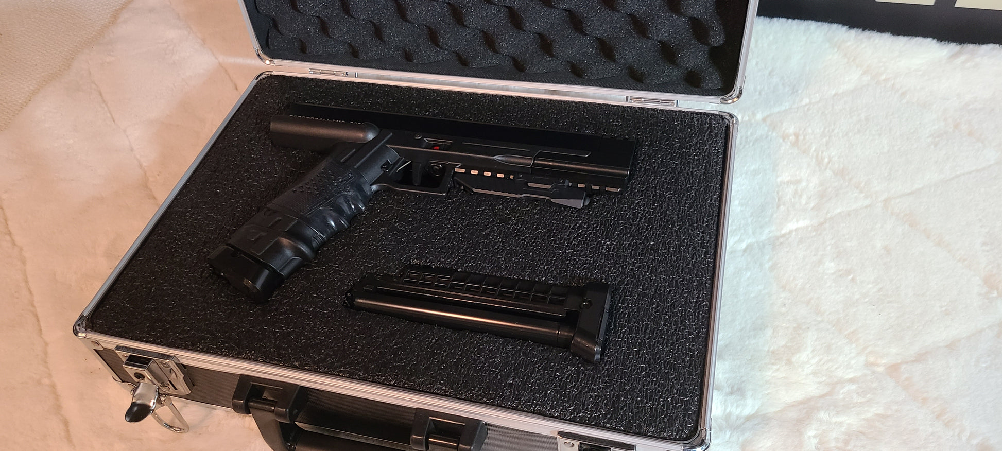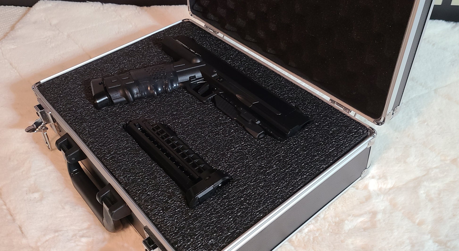 This Pepperball TMP is tuned up, with stock barrel, power plug, 2 highly coveted 3rd gen 8 round magazine's, compensator and bottom rail.