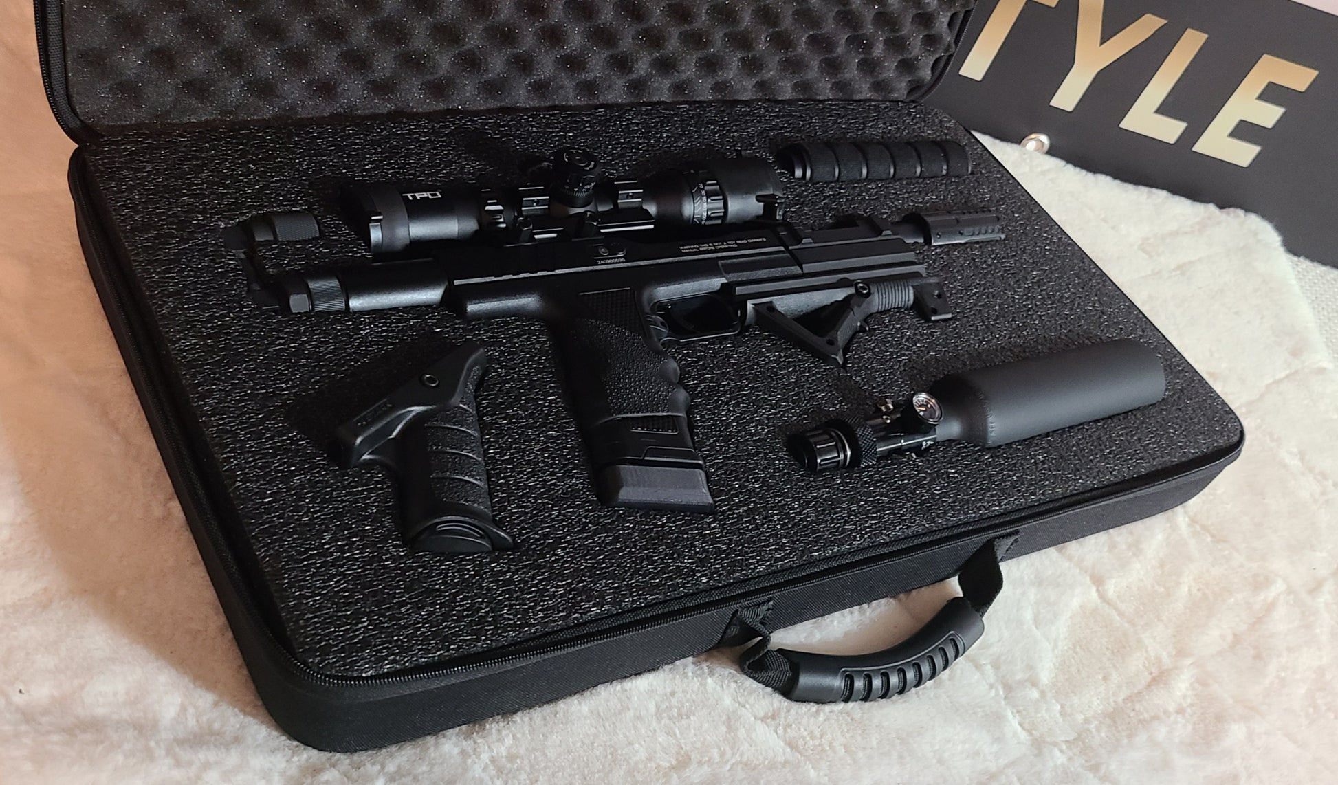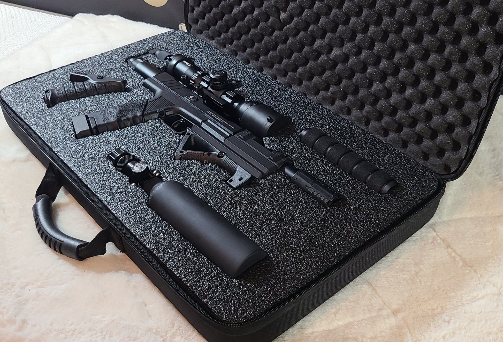 POWERHOUSE #1 Is an absolute beast, sniper tactical scope, large power mod, 11 inch barrel, custom side mount, forgrip with red dot lazer, and more.